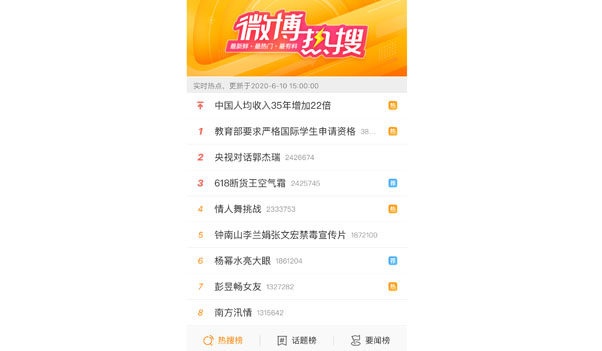 6月10日晚,龔先生打開微博熱搜榜時(shí),一度以為自己的手機(jī)或者網(wǎng)絡(luò)出了問題——刷新了好幾遍,榜單上的內(nèi)容依然沒有變化。