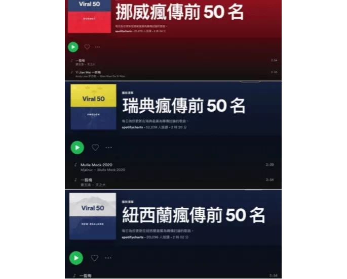在國(guó)際音樂(lè)平臺(tái)Spotify榜單上,《一剪梅》近期拿到的好成績(jī)有:挪威第一、瑞典第二、新西蘭第一、芬蘭第二。