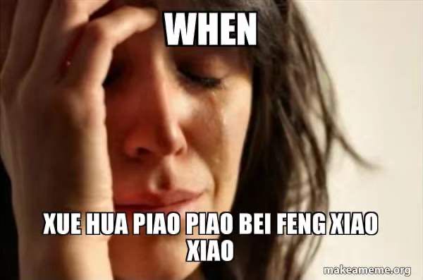 外國(guó)網(wǎng)友認(rèn)為,這句歌詞讓人聽(tīng)出了“孤寂絕望的感覺(jué)”,再加上那種讓他們“生不如死”的中文發(fā)音,他們漸漸把它變成了一個(gè)梗,以表示自己面臨的情況很窘迫、很慘。于是,“XUE HUA PIAO PIAO BEI FENG XIAO XIAO”便成了百搭的后綴——月底沒(méi)錢了,和女朋友分手了,后面都可以加上一句“XUE HUA PIAO PIAO BEI FENG XIAO XIAO”。