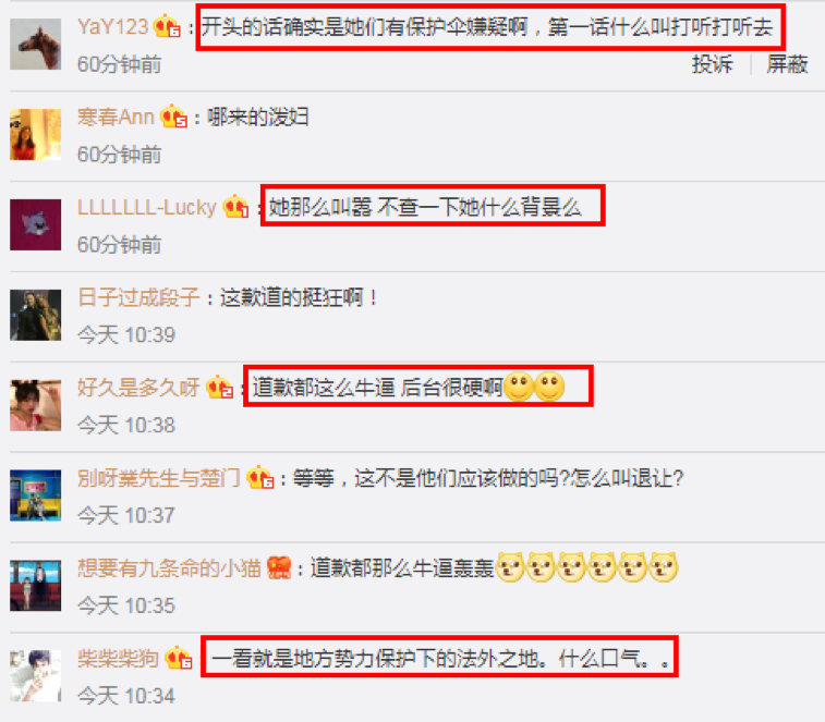 有網(wǎng)友評論:“什么叫‘打聽打聽去’,有保護傘嫌疑!”“道歉都這么牛,后臺很硬!”“那么叫囂,不查一下什么背景嗎?”