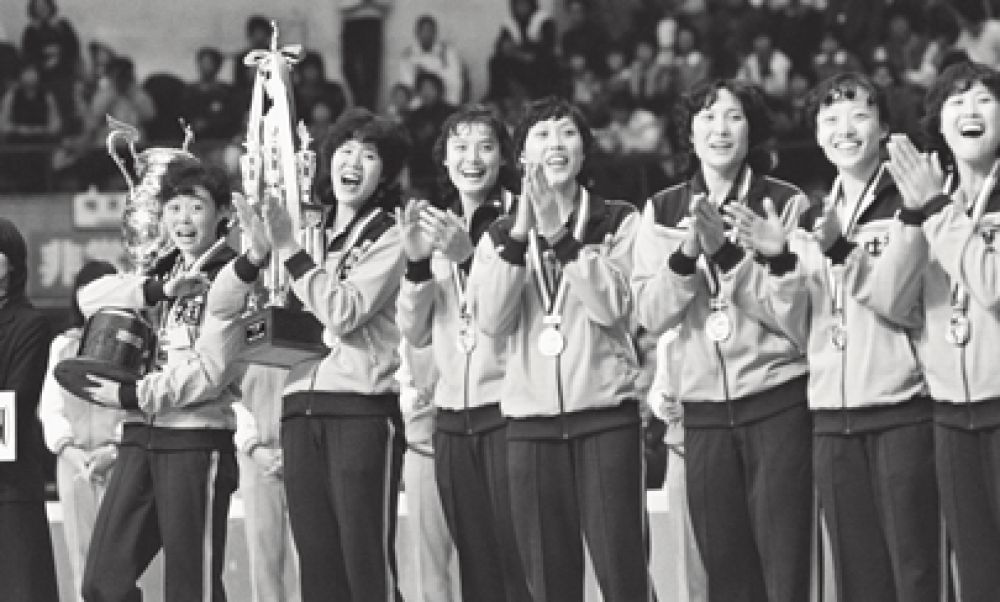 1981年11月16日,郎平(左二)與隊友在奪得第三屆世界杯女子排球賽冠軍后領(lǐng)獎