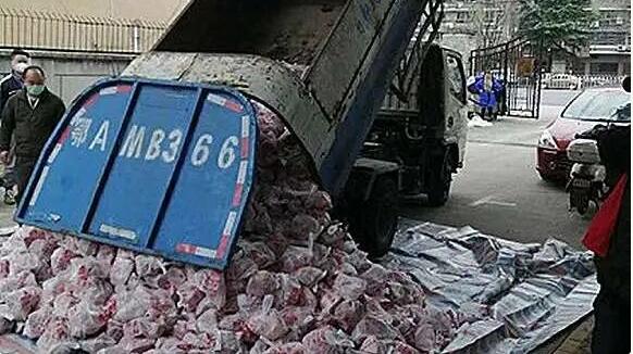 3月11日下午,網(wǎng)傳武漢青山區(qū)鋼都花園管委會(huì)用環(huán)衛(wèi)車運(yùn)輸居民購(gòu)買(mǎi)的平價(jià)肉。從發(fā)布的圖片看,一輛平日里裝載垃圾的環(huán)衛(wèi)車正打開(kāi)后蓋,往鋪著塑料布的地上傾倒一袋袋豬肉。