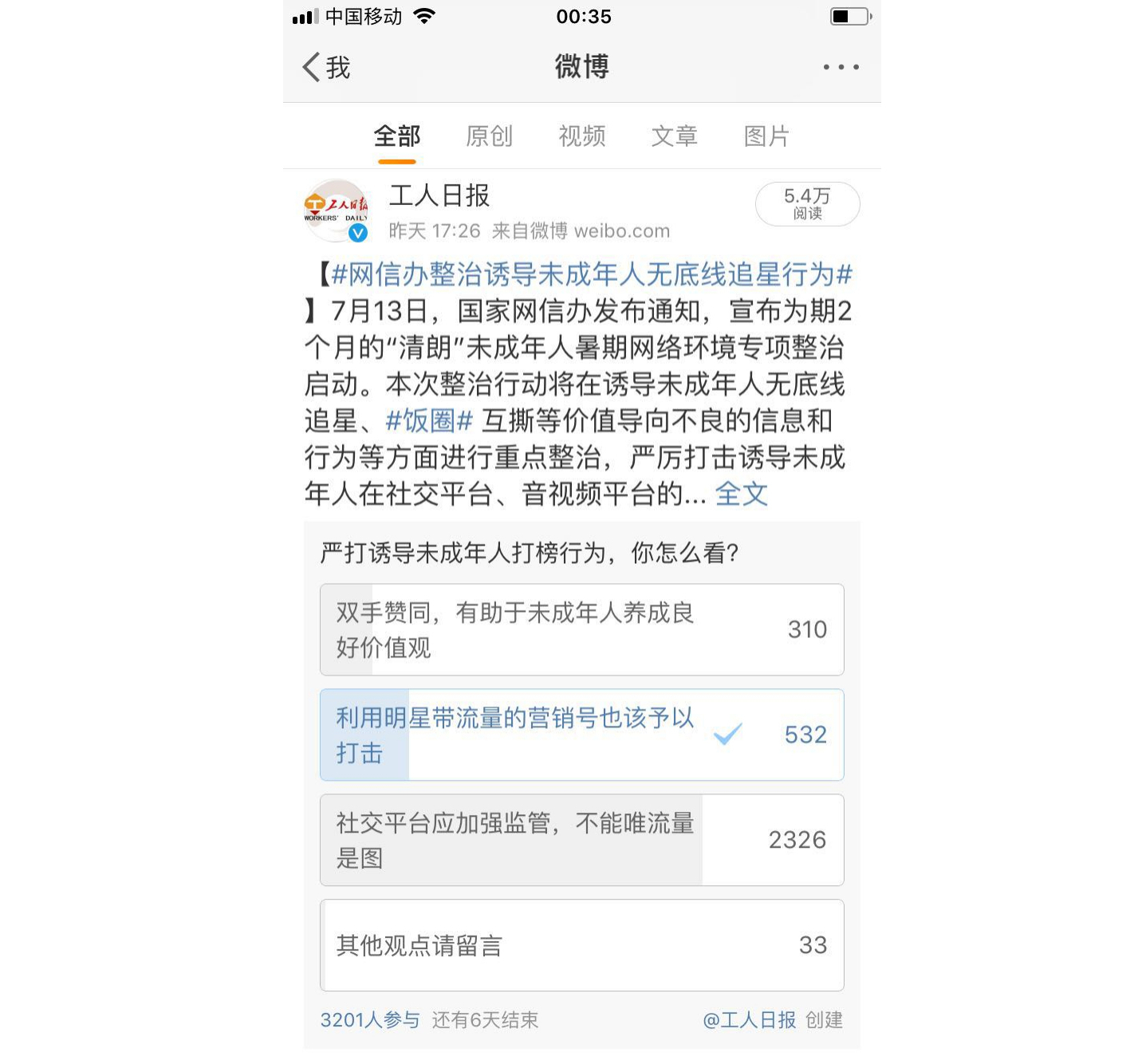 明星“飯圈”問題,在網(wǎng)絡(luò)上曾遭到不少網(wǎng)友的深惡痛絕。工人日報(bào)官方微博上一項(xiàng)“嚴(yán)打誘導(dǎo)未成年人打榜行為,你怎么看”的調(diào)查中,絕大多數(shù)網(wǎng)友將票投給了“社交平臺(tái)應(yīng)加強(qiáng)監(jiān)管,不能唯流量是圖”,也有不少網(wǎng)友表示“利用明星帶流量的營銷號(hào)也該予以打擊”。