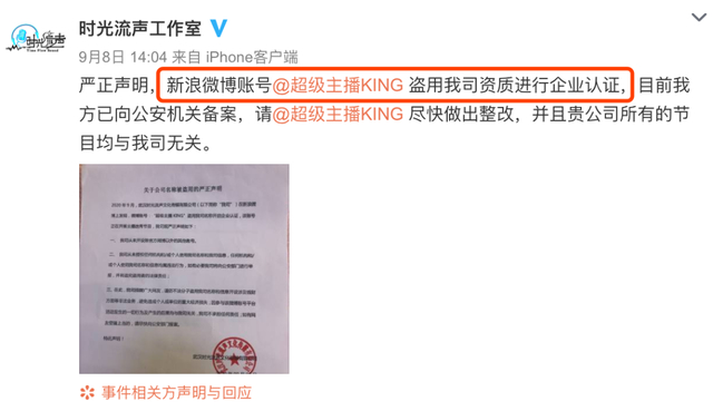 結(jié)果,網(wǎng)友的錦鯉夢(mèng)剛開(kāi)始做,就被“提溜”起來(lái)。一天后,“時(shí)光流聲工作室”發(fā)布聲明,表示“超級(jí)主播KING”盜用了自己公司的資質(zhì)進(jìn)行企業(yè)認(rèn)證,已向公安機(jī)關(guān)備案,信小呆也在微博發(fā)布了道歉信。同時(shí),信小呆作為有獎(jiǎng)活動(dòng)的發(fā)布者,被微博從重處罰。