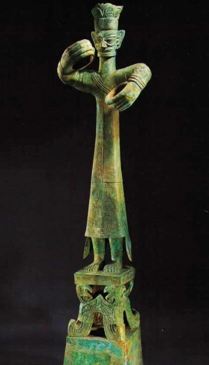 (青銅大立人像。1986年于三星堆遺址二號祭祀坑出土)