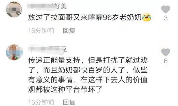 于是,各種無腦秀下限、蹭熱點(diǎn)的奇葩行為開始粉墨登場(chǎng)——“擺攤奶奶”因?yàn)楸蝗藝^,直言“不高興,因?yàn)楹芾邸?;以“拉面哥”為背景直播的,不少人在一旁著奇裝異服搔首弄姿;進(jìn)入“大衣哥”家庭的,甚至涉嫌違法。