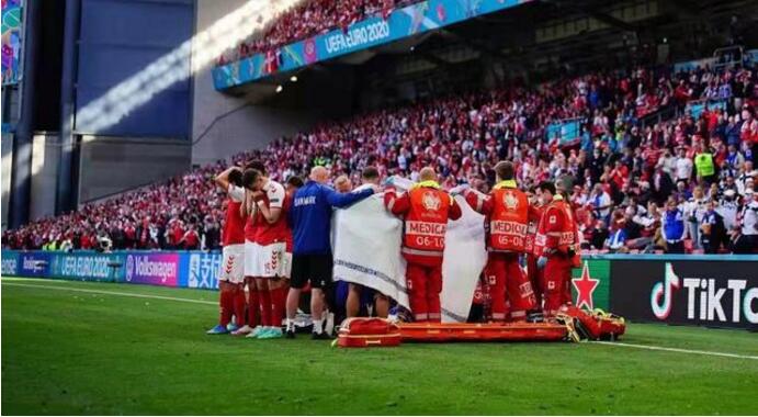 比賽進(jìn)行到上半場(chǎng)第42分鐘時(shí),丹麥隊(duì)中場(chǎng)核心埃里克森在無(wú)對(duì)抗情況下突然倒地。發(fā)現(xiàn)他失去意識(shí)后,雙方隊(duì)員立即示意隊(duì)醫(yī)和待命的醫(yī)療人員入場(chǎng)查看,裁判則及時(shí)叫停比賽。當(dāng)現(xiàn)場(chǎng)搶救展開(kāi)時(shí),丹麥隊(duì)員自發(fā)圍成一圈,守護(hù)埃里克森不被現(xiàn)場(chǎng)無(wú)處不在的攝像機(jī)打擾。同時(shí),兩隊(duì)的球迷也在看臺(tái)上高呼埃里克森的名字為他祈禱。