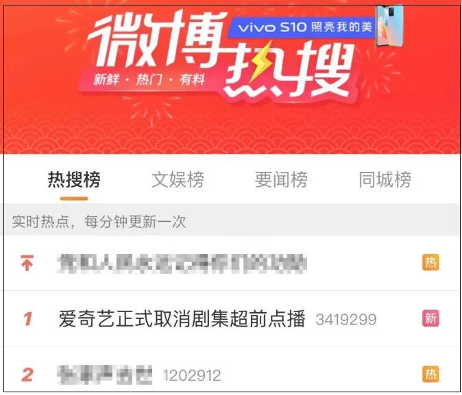 (取消超前點播的新聞沖上熱搜首位 截圖自微博界面)