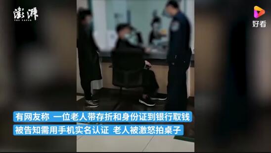 近日,成都一名老人用存折到銀行取錢,被柜員要求需要用手機接收驗證碼完成實名認證。視頻中,老人說:“我有身份證,我的身份證就是證明,全國通用?!钡珱]帶手機的老人還是沒能取到錢。