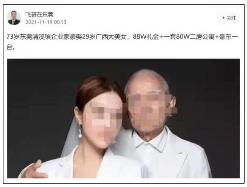 11月19日,一名叫“飛哥在東莞”的營銷賬號在網(wǎng)絡(luò)平臺發(fā)文稱“73歲東莞清溪鎮(zhèn)企業(yè)家豪娶29歲廣西大美女”,還配發(fā)了“老夫少妻”的照片。很快就有網(wǎng)絡(luò)博主發(fā)現(xiàn),這是她和外公幾年前去上海游玩的照片。