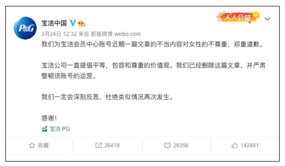 很快,該公司刪除這篇文章,回應(yīng)稱將嚴(yán)肅整頓該賬號(hào)的運(yùn)營(yíng),對(duì)文章的不當(dāng)內(nèi)容以及對(duì)女性的不尊重表示鄭重道歉。