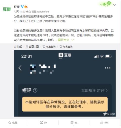 4月29日,豆瓣在微博平臺宣布近日已上線防“水軍”控評功能。功能開啟后,短評區(qū)將采用特定的點贊策略與排序算法,隨機展示部分短評,使得“水軍”無法通過集中點贊的方式引導(dǎo)短評區(qū)輿論。同時,該影視條目的短評區(qū)域頂部會出現(xiàn)警示標識,提醒用戶該影視劇短評情況異常。