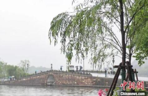 補(bǔ)植后的西湖斷橋邊柳樹。中新社記者 王剛 攝