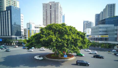 矗立在城市環(huán)島中央的大榕樹。新華社記者 周義 攝
