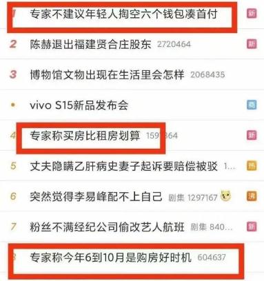 先是5月19日,“專家不建議年輕人掏空六個錢包湊首付”“專家稱買房比租房劃算”“專家稱今年6到10月是購房好時機”,這三個與買房有關的話題同時上了熱搜,隨后,“建議專家不要建議”沖到熱搜第一;