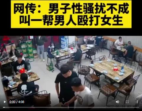的確,但凡看過該視頻的人都會(huì)出離憤怒:毆打過程持續(xù)近4分鐘,白衣女子被數(shù)名男子從店內(nèi)打到店外,期間她被拽頭發(fā)拖行,被猛踹頭部,被用凳子、酒瓶砸……即使透過攝像頭,打人男子口中不斷叫喊的“打死你”依然能聽得很清楚,女子身上的血跡也清晰可見。與白衣女子同行的黑衣女子同樣被多人粗暴地打倒在地。