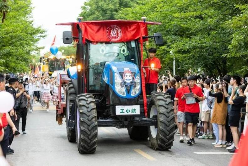 掛滿霓虹彩燈的拖拉機、“盛裝出行”的聯(lián)合收割機、遛狗出街的畢業(yè)生隊列,還有6匹高頭大馬……你沒看錯,這是華中農(nóng)業(yè)大學畢業(yè)典禮的一部分。典禮一反莊重、嚴肅、秩序感氛圍,將巡游展示納入其中,學校領(lǐng)導還在機車上與師生熱情互動。