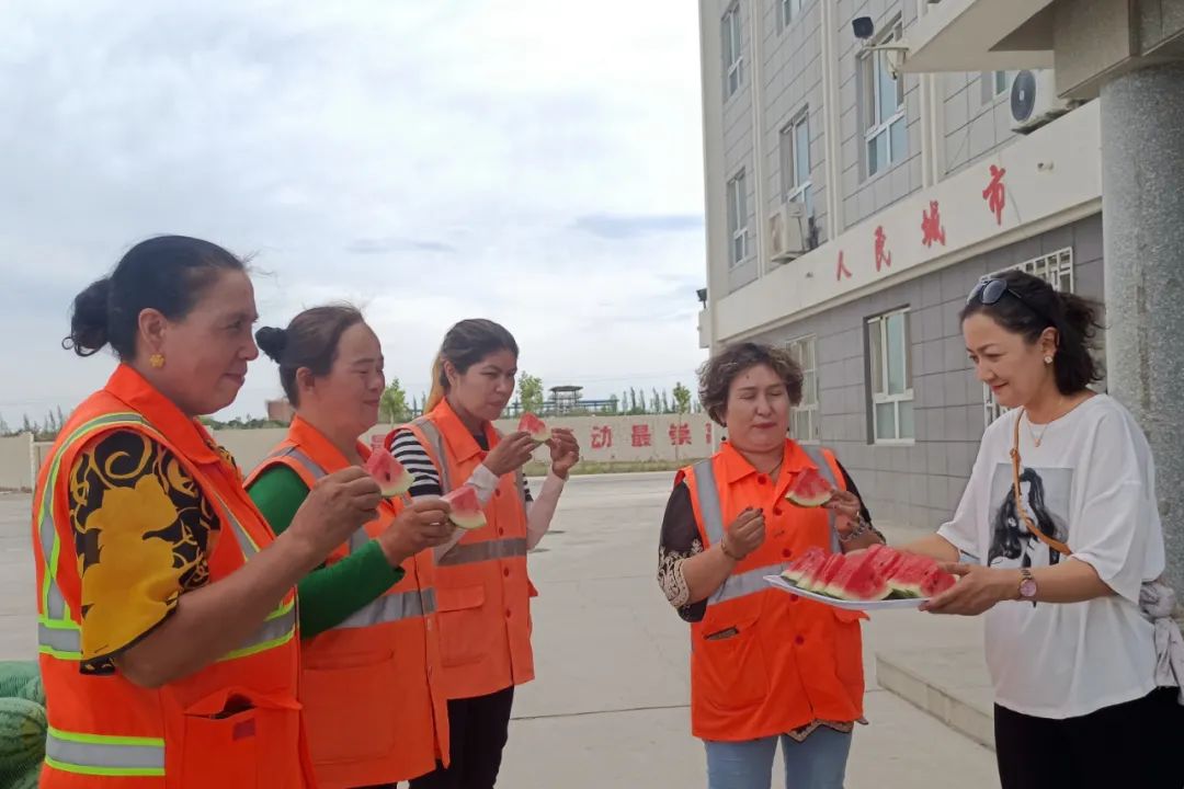 慰問現(xiàn)場,一線環(huán)衛(wèi)工人們吃著甘甜可口的西瓜,露出了開心的笑容。阿孜古麗說:“非常感謝黨和政府對我們環(huán)衛(wèi)工人的關(guān)心,感謝工會(huì)給我們送的西瓜。”