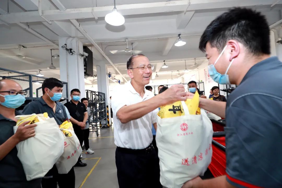 入夏以來,浙江省總工會切實做好常態(tài)化疫情防控形勢下夏季防暑降溫工作,及時制訂開展高溫慰問活動方案。按照方案,省總工會組成12個慰問組,深入基層一線,集中慰問省重點工程一線建設者、新就業(yè)形態(tài)勞動者、高溫作業(yè)場所和其他露天作業(yè)場所的一線職工。(文/阮向民 圖/鄒偉鋒)