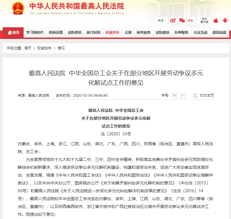 圖為最高人民法院、中華全國總工會聯(lián)合印發(fā)《關(guān)于在部分地區(qū)開展勞動爭議多元化解試點工作的意見》截圖。圖片來源:中華人民共和國最高法院官網(wǎng)