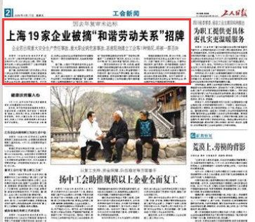 工人日?qǐng)?bào)刊發(fā)的題為《上海19家企業(yè)被摘“和諧勞動(dòng)關(guān)系”招牌》的報(bào)道。圖片來(lái)源,2020年4月17日《工人日?qǐng)?bào)》二版截圖。