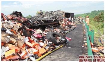 7月19日凌晨3時許,滬昆高速湖南境內(nèi)邵懷段1309KM處,一輛裝載;返男∝涇嚺c一輛福建開往四川宜賓的大客車追尾后爆炸燃燒,截至目前,事故共造成5輛車燒毀,已確認(rèn)43人遇難,僅大客車中就有41人。(7月20日《新華每日電訊》)