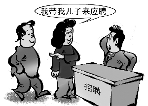 近日,陜西西安市一場(chǎng)招聘會(huì)上,出現(xiàn)了白發(fā)老人為失業(yè)在家的孫子找工作的情景,讓人很是心疼。年后招聘會(huì)一場(chǎng)接一場(chǎng),在江蘇南京市的人才市場(chǎng),也出現(xiàn)類似一幕:一位已當(dāng)爸爸的年輕應(yīng)聘者旁邊還有老媽陪著一起找工作,老媽主動(dòng)替兒子回答問題,而用人單位對(duì)這種“包辦”大都不認(rèn)可。(2月19日《金陵晚報(bào)》)