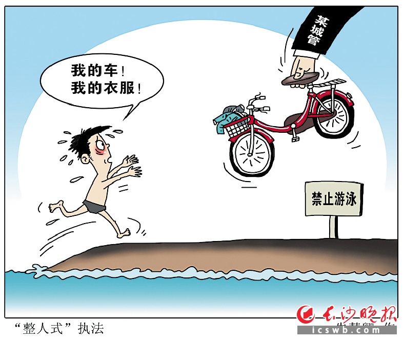 其次,在執(zhí)法過程中,既然“經(jīng)說服有4輛車按照線位停放”,為何不能將畢國昌的自行車也矯正歸位?就算一時找不到人,城管也只需到海灘吆喝兩聲便可得到回應(yīng)。強行將違規(guī)者的自行車鎖鏈剪斷并沒收其衣物,并非只是懶政那么簡單,而是要等著瞧游泳者赤裸上岸獻丑和焦急尋找衣物的落魄窘態(tài)。這種整人式執(zhí)法,往深處思考,顯然已經(jīng)不只是執(zhí)法方式的問題,而是漠視公民人格、罔顧公民權(quán)利的違法之舉。