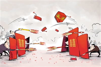 4月10日,廣西玉林市博白縣有兩戶村民辦婚禮,雙方迎親隊(duì)在路中相遇,由于有感同日辦喜宴兼狹路相逢是“不吉利”,加上雙方在路上又各不相讓,結(jié)果引發(fā)爭(zhēng)執(zhí),繼而爆發(fā)激烈沖突。雙方從當(dāng)日下午2時(shí)一直互相拋擲煙花、追打火拼,直到傍晚6時(shí)許才結(jié)束。(中國(guó)青年網(wǎng))