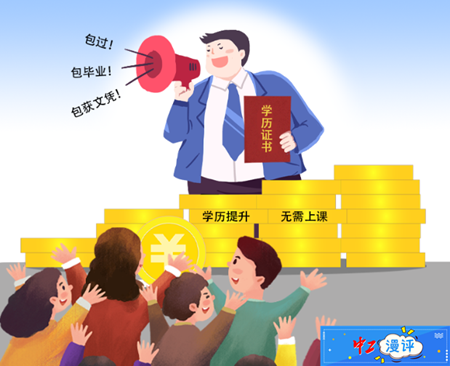 在不少人有著“學(xué)歷焦慮”的背景下,“包過(guò)”“包畢業(yè)”“包獲文憑”的學(xué)歷提升廣告屢見(jiàn)不鮮。然而,一些宣稱(chēng)“包過(guò)”的教育機(jī)構(gòu)并沒(méi)有給學(xué)生報(bào)名入學(xué),未獲官方授權(quán)的機(jī)構(gòu)大肆招生,部分機(jī)構(gòu)更是涉嫌違規(guī)違法經(jīng)營(yíng)。(據(jù)2月16日《工人日?qǐng)?bào)》報(bào)道)
