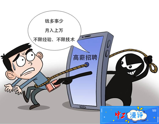 網(wǎng)絡(luò)招聘為求職者拓寬了就業(yè)渠道、提供了多樣化的職業(yè)選擇,這本是好事一樁,但有些“感官敏銳”的不法分子似乎也“嗅”到了“商機(jī)”,瞄準(zhǔn)了求職者的錢包。他們?cè)诰W(wǎng)絡(luò)招聘中打出“錢多事少”“月入上萬(wàn)”“不限經(jīng)驗(yàn)、不限技術(shù)”等一系列虛假?gòu)V告,畫好一張張“大餅”,引誘不知情者上鉤。求職者對(duì)待招聘信息要理性分辨,少些貪圖便宜的僥幸心理,當(dāng)心“天上掉餡餅,地下有陷阱”。