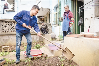 4月25日,在合肥市西園新村徐一琦老人家院內(nèi),吳雄飛(左)幫老人打理菜園。 新華社記者 杜 宇攝