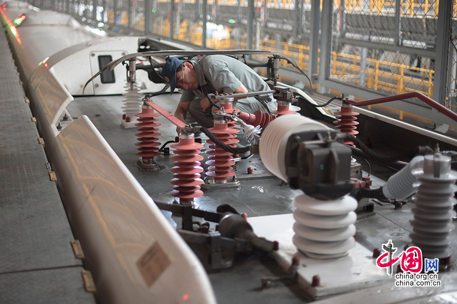 劉波登上車頂檢修動車。 中國網(wǎng)記者 張若夢 攝