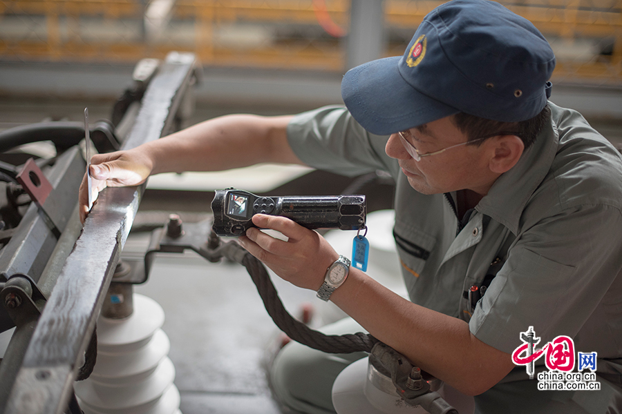 劉波正用錄像手電和卡尺對動車受電弓進行檢查。 中國網(wǎng)記者 張若夢 攝