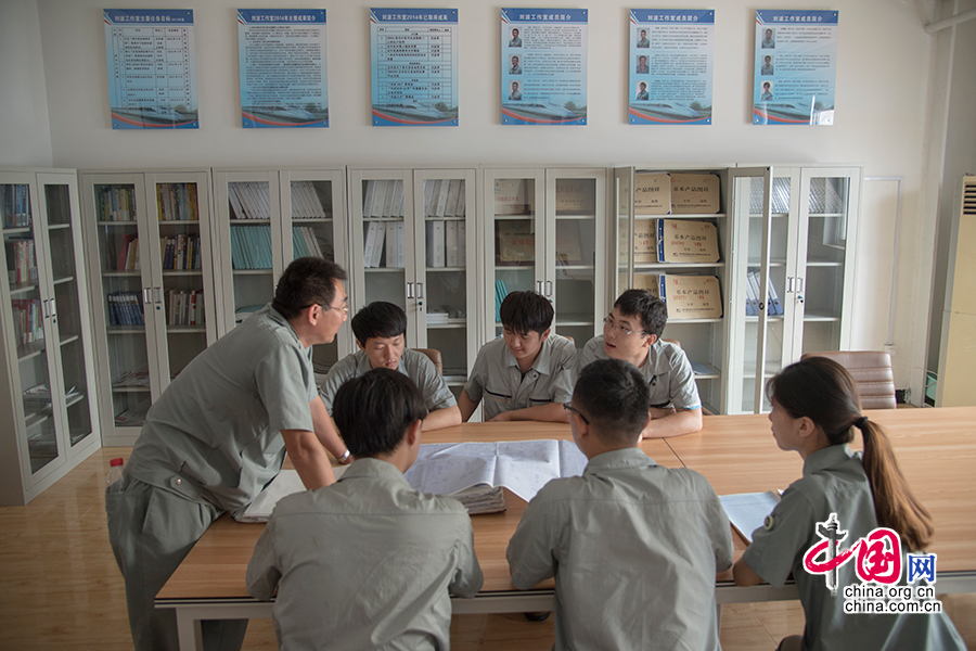 劉波在“劉波勞模創(chuàng)新工作室”中和年輕同事交流分享。 中國網(wǎng)記者 張若夢 攝