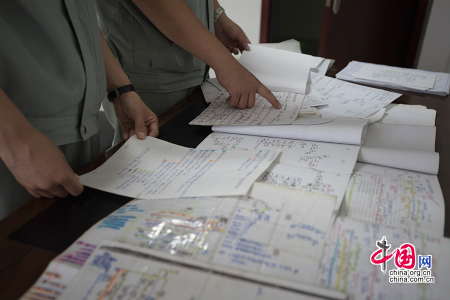 年輕同事向劉波請教問題,劉波查閱自己的學習筆記。一些眼看有被破損傾向的手稿被劉波用透明膠條粘了個遍。 中國網(wǎng)記者 張若夢 攝