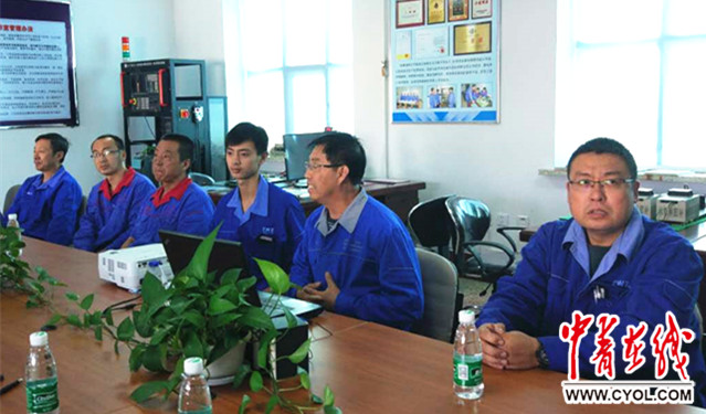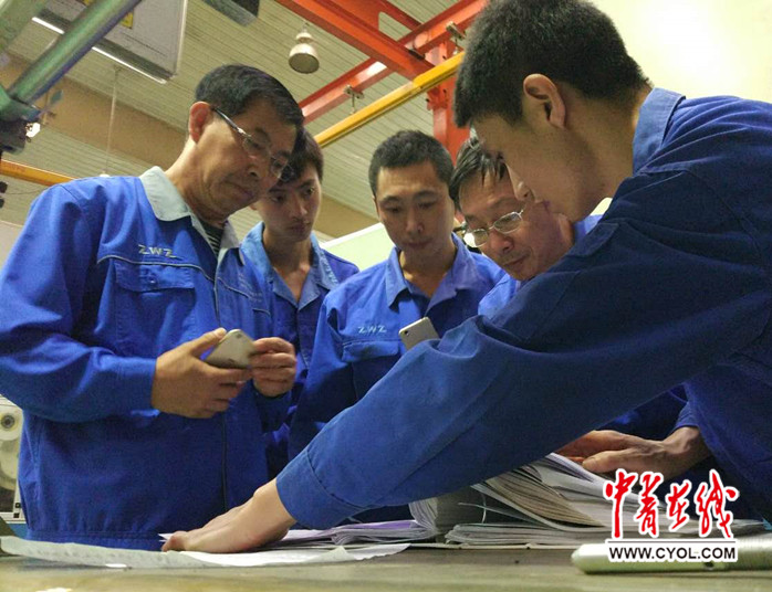 李書乾(左一)正帶領徒弟于慶壯(左二)在車間與眾人進行研討
