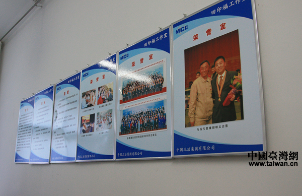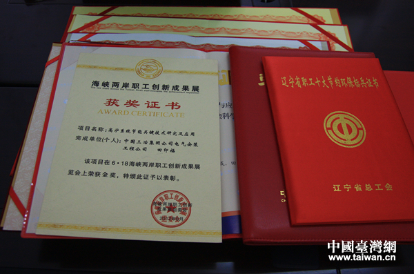 田印福曾獲得“全國職工技術創(chuàng)新獎”、“海峽兩岸創(chuàng)新成果展金獎”、“遼寧省十大創(chuàng)新成果獎”、“鞍山市科技進步獎”等獎項40余項,榮獲“遼寧省節(jié)約環(huán)保標兵”、“遼寧省勞動模范”、“遼寧好人”、“全國勞動模范”等諸多稱號,成為享受國務院特殊津貼的專家。圖為田印福展示的部分榮譽。(中國臺灣網 李帥 攝)