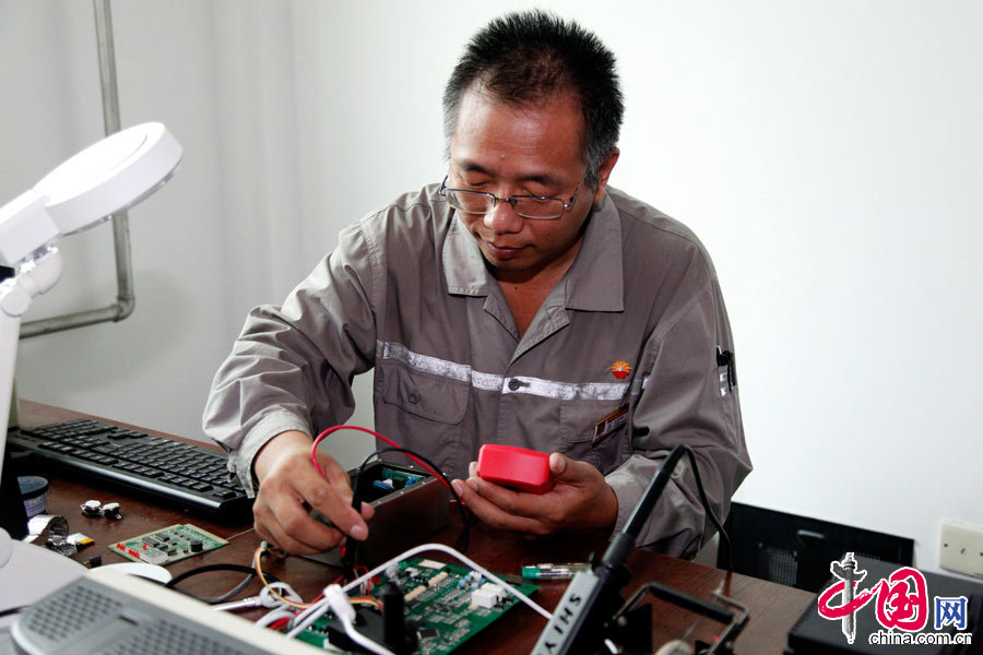 自入職27年以來(lái),刁克劍從一名普通的鉗工到成為微電子領(lǐng)域享譽(yù)全國(guó)的科研專(zhuān)家,憑借自己濃厚的興趣愛(ài)好和堅(jiān)持不懈的努力,豐富的生產(chǎn)實(shí)踐和先進(jìn)的技術(shù),造就了今天的成就。他常說(shuō):“在我的理解中,設(shè)計(jì)出來(lái)的不是產(chǎn)品,而是作品。”圖為,刁克劍在查看一塊“機(jī)器人”的電路板上的細(xì)節(jié)。中國(guó)網(wǎng) 李佳攝影