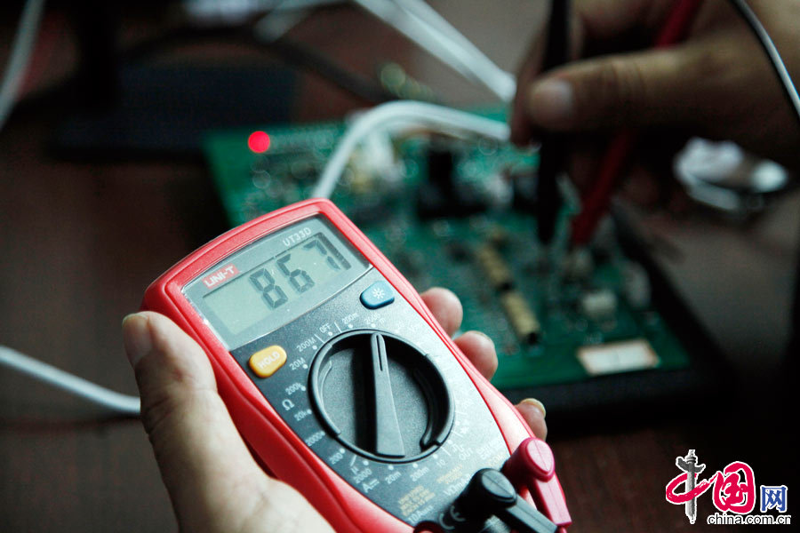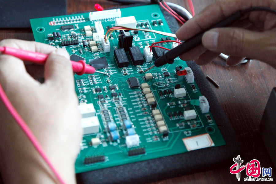 刁克劍告訴記者,“機(jī)器人”的研究先后經(jīng)過(guò)3年內(nèi)多次試驗(yàn)。同事說(shuō)他在工作室經(jīng)常忘了時(shí)間,夜半而起,天亮而熄,成為他常態(tài)。圖為完“機(jī)器人”的電路板。中國(guó)網(wǎng) 李佳攝影