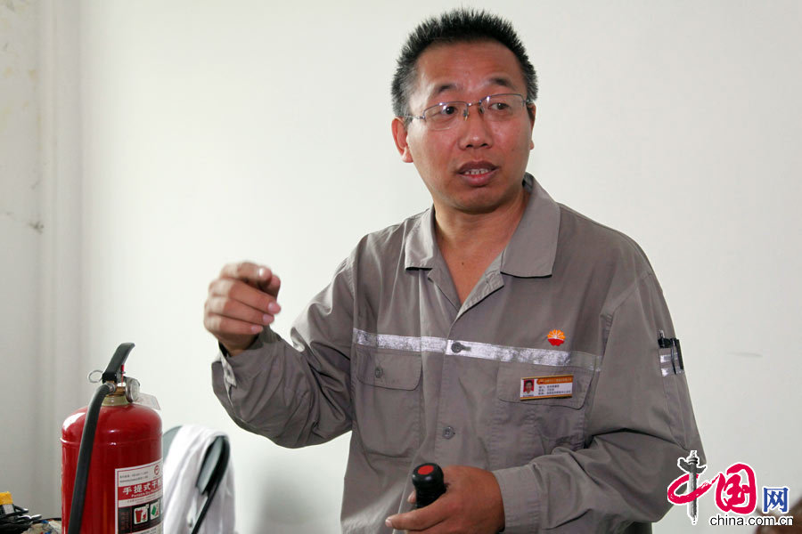 石化專(zhuān)用智能滅火抑爆系統(tǒng)——滅火抑爆機(jī)器人,此系統(tǒng)可以24小時(shí)全天候完成無(wú)人智能值守,反應(yīng)速度快,動(dòng)作可靠,可以將火災(zāi)爆炸事故隱患消滅在萌芽狀態(tài),填補(bǔ)了行業(yè)空白。圖為刁克劍進(jìn)行數(shù)據(jù)測(cè)試。中國(guó)網(wǎng) 李佳攝影