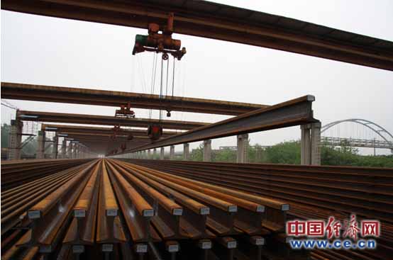 吊機(jī)正在擺放焊接完成的500米成品鋼軌。中國(guó)經(jīng)濟(jì)網(wǎng)記者佟明彪/攝