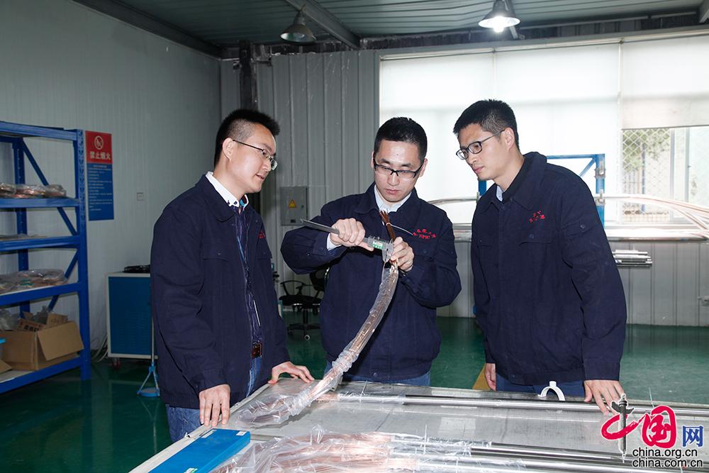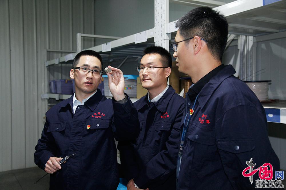 3月29日,王廣金與同事在工作現(xiàn)場進(jìn)行關(guān)鍵零部件的質(zhì)量檢測。中國網(wǎng) 李佳攝影