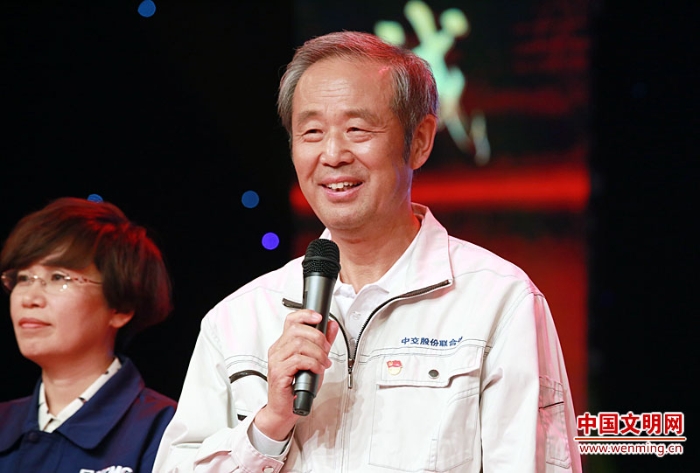 北京金隅琉水環(huán)??萍加邢薰臼炝现苽滠囬g主任、全國勞動模范、高級技師郭玉全接受現(xiàn)場采訪。中國文明網(wǎng) 趙彬宇 攝