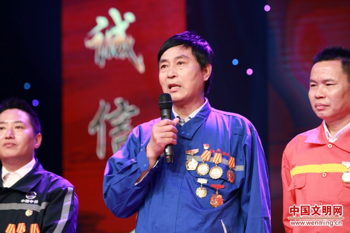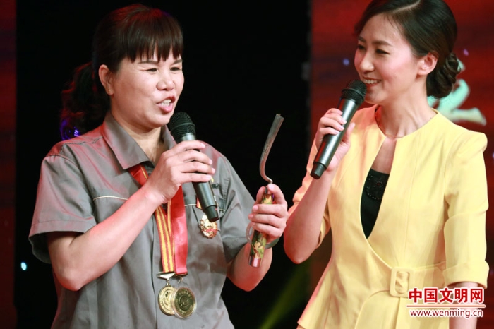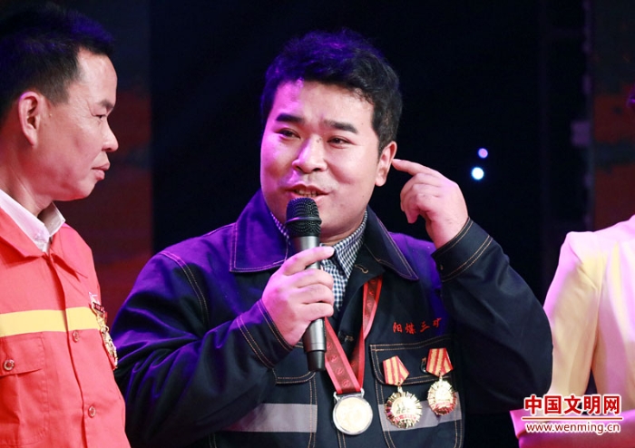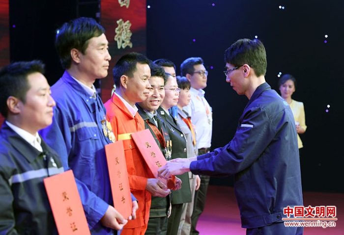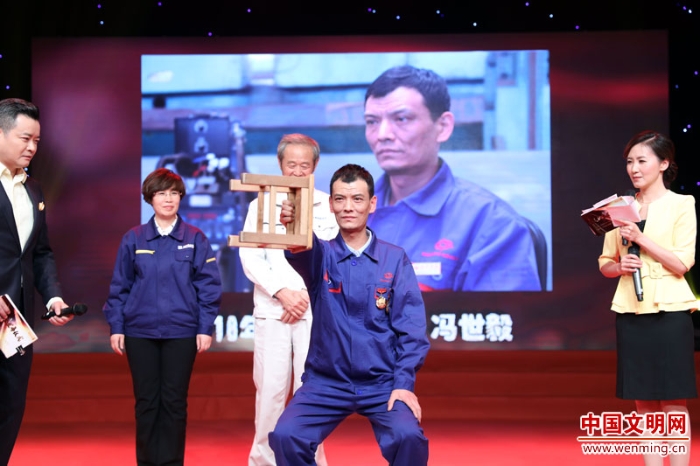 2017年“最美職工”、國家科技進步二等獎、全國五一勞動獎?wù)?、全國職工職業(yè)道德建設(shè)標兵、中國青年五四獎?wù)芦@得者,中國航發(fā)沈陽黎明航空發(fā)動機(集團)有限責任公司職工、高級技師洪家光,為“最美職工”頒發(fā)榮譽證書。中國文明網(wǎng) 王楠 攝