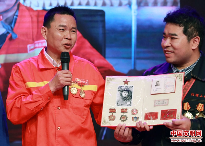 中國石油集團西部鉆探工程有限公司試油公司井下作業(yè)工具工、“石油名匠”重點培養(yǎng)對象、西部鉆探“勞動模范”譚文波(左)展示父親曾是一名志愿軍戰(zhàn)士。中國文明網(wǎng) 王楠 攝