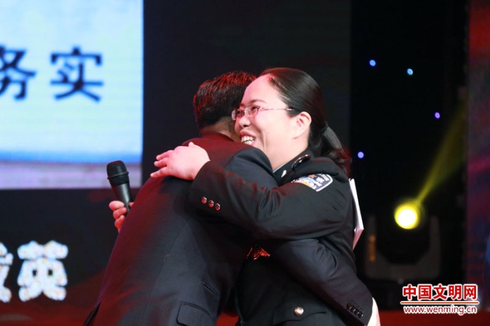 主持人在聽到重慶市銅梁區(qū)公安局刑事偵查支隊三大隊大隊長楊發(fā)英講述為了法醫(yī)工作判斷準確,14年不化妝不噴香水的細節(jié)時,主動與楊發(fā)英擁抱表示敬佩。中國文明網(wǎng) 王楠 攝