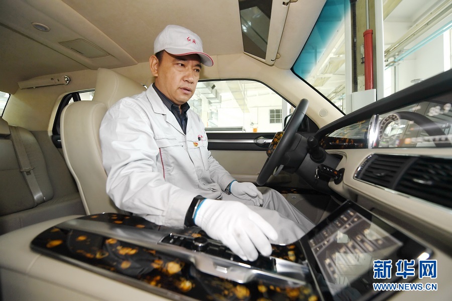 吳殿維在一汽紅旗工廠檢查一輛紅旗轎車的內(nèi)部功能(4月25日攝)。國慶閱兵、APEC會(huì)議、G20杭州峰會(huì)……這些舉世矚目的活動(dòng)中少不了“國車”紅旗的身影。耀眼的品牌背后,一支作風(fēng)過硬的車輛服務(wù)保障團(tuán)隊(duì)保證著出行任務(wù)的萬無一失。一汽工人吳殿維就是其中的一員,被譽(yù)為不辱使命的“國車衛(wèi)士”。新華社記者 張楠 攝