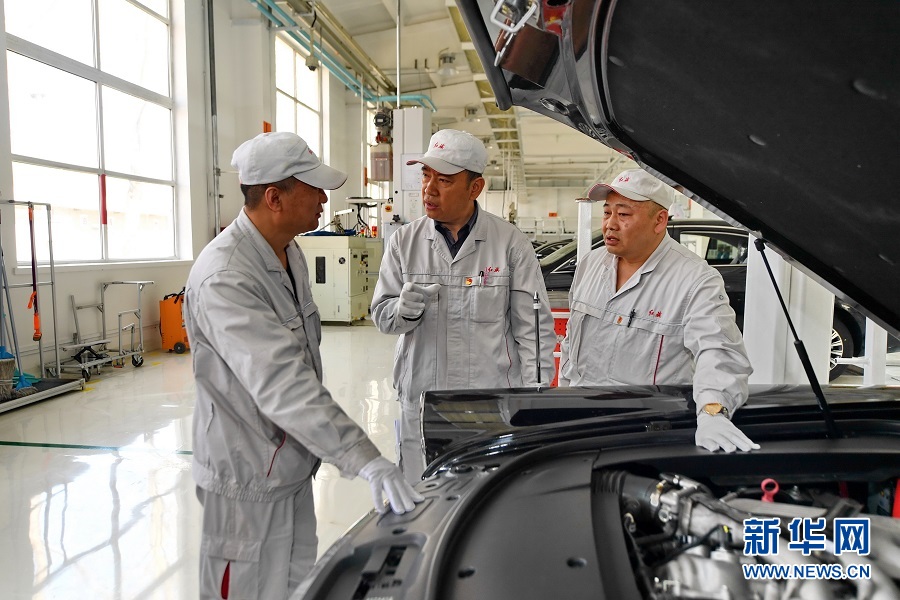 吳殿維(中)在一汽紅旗工廠與同事商量汽車檢修方案(4月25日攝)。國慶閱兵、APEC會(huì)議、G20杭州峰會(huì)……這些舉世矚目的活動(dòng)中少不了“國車”紅旗的身影。耀眼的品牌背后,一支作風(fēng)過硬的車輛服務(wù)保障團(tuán)隊(duì)保證著出行任務(wù)的萬無一失。一汽工人吳殿維就是其中的一員,被譽(yù)為不辱使命的“國車衛(wèi)士”。新華社記者 張楠 攝