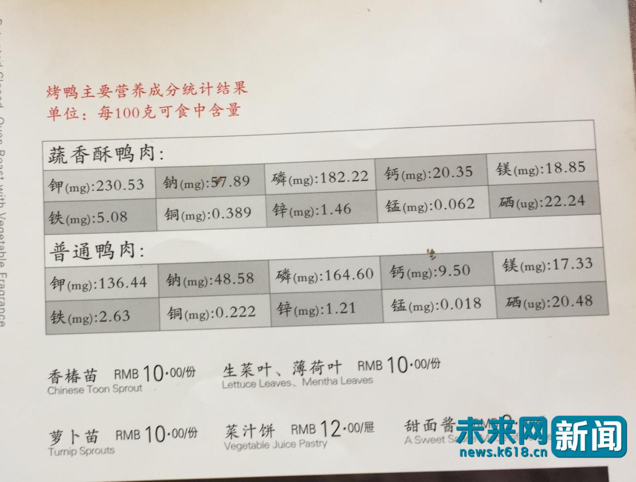 在“便宜坊”的菜單上寫著烤鴨主要營養(yǎng)成分含量 未來網(wǎng)記者 何欣 攝